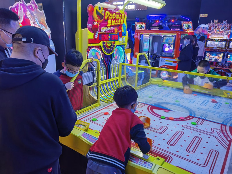 春節(jié)期間,在位于北京市朝陽區(qū)西大望路的某大型購(gòu)物中心休閑娛樂區(qū),家長(zhǎng)和孩子們均佩戴口罩,在家長(zhǎng)的看護(hù)下,孩子們保持安全距離,玩桌面冰球不亦樂乎。