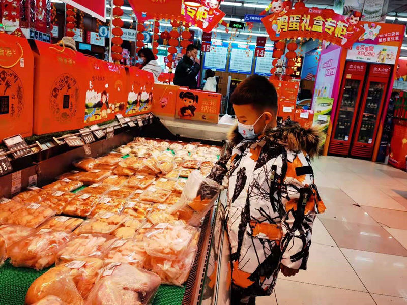 大年三十,超市內(nèi)充滿了節(jié)日的喜慶氛圍。一位小朋友手套塑料袋,正在學(xué)習(xí)如何在做好個(gè)人防護(hù)的情況下,安全購(gòu)買冷鏈?zhǔn)称贰?/p>