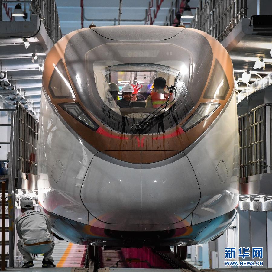 參加熱滑試驗(yàn)的技術(shù)人員對(duì)廣州地鐵18號(hào)線時(shí)速160公里電客車進(jìn)行發(fā)車前最后一次設(shè)備狀況查驗(yàn)(3月3日攝)。新華社記者 劉大偉 攝