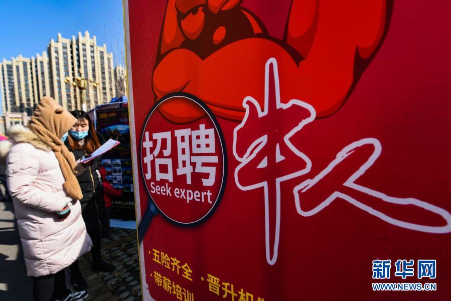 山東省青州市舉辦第20屆企業(yè)人才就業(yè)招聘會(huì),求職者在招聘會(huì)上了解崗位信息(2月27日攝)。新華社發(fā)(王繼林 攝)