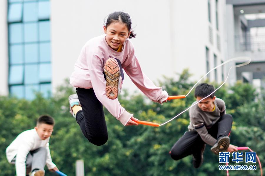 2020年12月9日,重慶市九龍坡區(qū)西彭鎮(zhèn)第一小學(xué)校跳繩隊(duì)隊(duì)員在進(jìn)行花樣跳繩訓(xùn)練。該校從1999年開始引進(jìn)跳繩,開展特色體育活動(dòng)。新華社記者 劉潺 攝