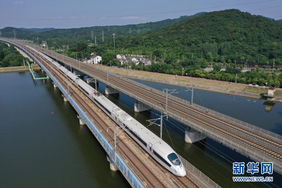 一列和諧號(hào)動(dòng)車組列車駛經(jīng)京滬高速鐵路南京段(無人機(jī)照片,2020年6月30日攝)。新華社發(fā)(方東旭 攝)