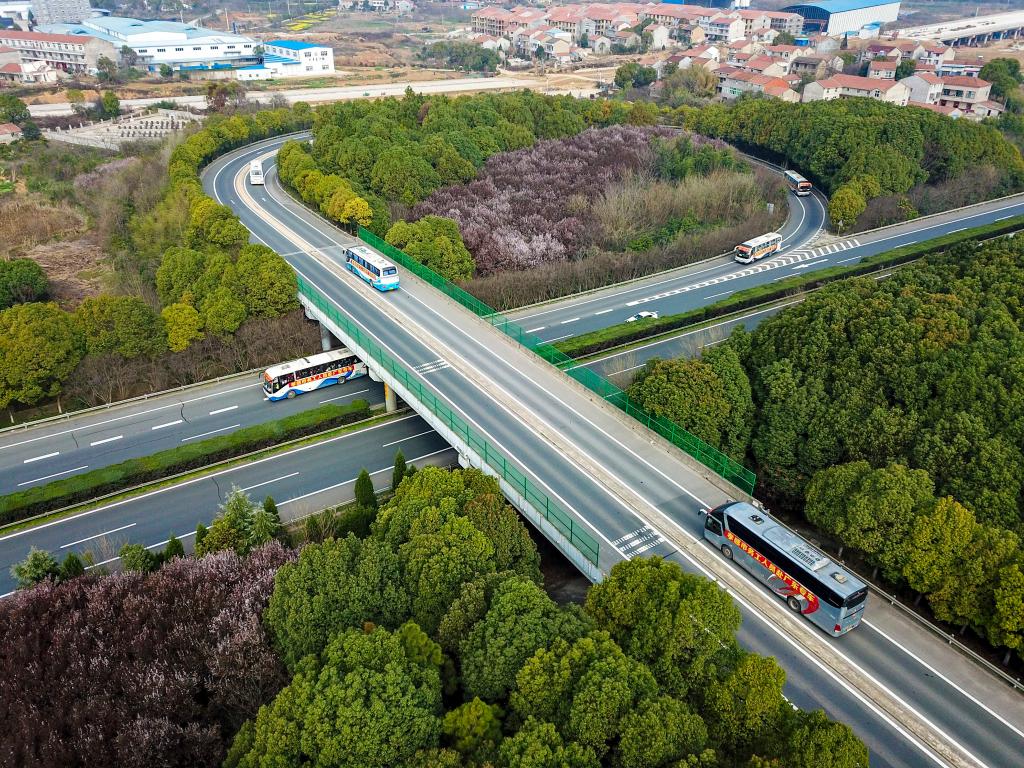 大巴車隊行駛在京港澳高速公路孝感段上。新華社記者 胡虎虎 攝