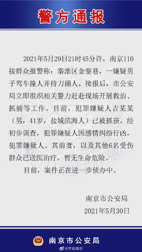 據(jù)南京市公安局官方微博消息,2021年5月29日21時(shí)45分許,南京110接群眾報(bào)警稱:秦淮區(qū)金鑾巷,一嫌疑男子駕車撞人并持刀捅人。接報(bào)后,南京市公安局立即組織相關(guān)警力趕赴現(xiàn)場(chǎng)開(kāi)展救治、抓捕等工作。目前,犯罪嫌疑人吉某某(男,41歲,鹽城濱海人)已被抓獲。經(jīng)初步調(diào)查,犯罪嫌疑人因感情糾紛行兇,犯罪嫌疑人、其前妻,以及其他6名受傷群眾已送醫(yī)治療,暫無(wú)生命危險(xiǎn)。