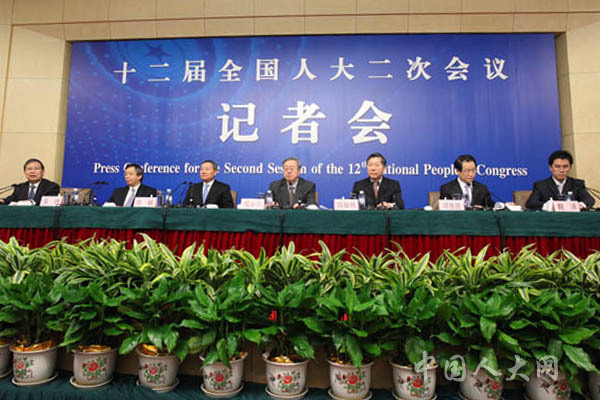 3月11日上午,十二屆全國(guó)人大二次會(huì)議在梅地亞中心舉行記者會(huì),中國(guó)人民銀行行長(zhǎng)周小川等五位嘉賓就“金融改革與發(fā)展”的相關(guān)問題回答中外記者的提問。圖為主席臺(tái)全景。羅榮 攝