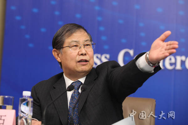 3月11日上午,十二屆全國(guó)人大二次會(huì)議在梅地亞中心舉行記者會(huì),中國(guó)人民銀行行長(zhǎng)周小川等五位嘉賓就“金融改革與發(fā)展”的相關(guān)問(wèn)題回答中外記者的提問(wèn)。圖為十二屆全國(guó)人大二次會(huì)議新聞中心副主任祝壽臣主持。羅榮 攝