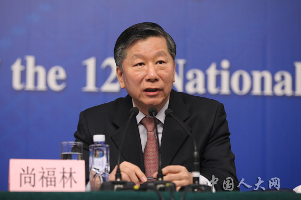 3月11日上午,十二屆全國(guó)人大二次會(huì)議在梅地亞中心舉行記者會(huì),中國(guó)人民銀行行長(zhǎng)周小川等五位嘉賓就“金融改革與發(fā)展”的相關(guān)問題回答中外記者的提問。圖為中國(guó)銀行業(yè)監(jiān)督管理委員會(huì)主席尚福林回答記者提問。羅榮 攝