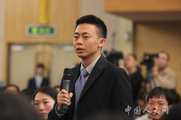 3月11日上午,十二屆全國人大二次會議在梅地亞中心舉行記者會,中國人民銀行行長周小川等五位嘉賓就“金融改革與發(fā)展”的相關問題回答中外記者的提問。圖為中央電視臺、中國網(wǎng)絡電視臺記者提問。羅榮 攝