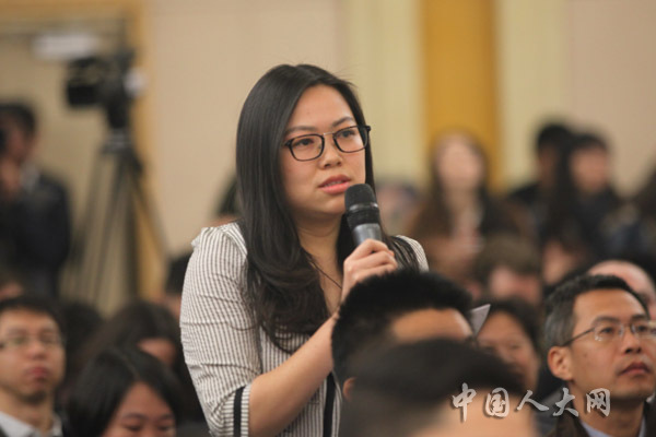 3月11日上午,十二屆全國人大二次會議在梅地亞中心舉行記者會,中國人民銀行行長周小川等五位嘉賓就“金融改革與發(fā)展”的相關(guān)問題回答中外記者的提問。圖為中央人民廣播電臺、央廣網(wǎng)記者提問。羅榮 攝