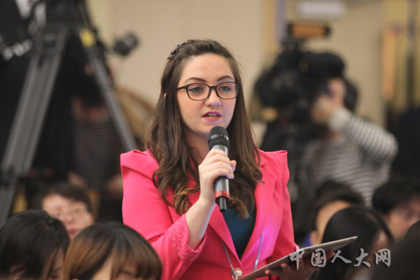 3月11日上午,十二屆全國人大二次會議在梅地亞中心舉行記者會,中國人民銀行行長周小川等五位嘉賓就“金融改革與發(fā)展”的相關(guān)問題回答中外記者的提問。圖為澳大利亞環(huán)球凱歌傳媒集團(tuán)記者提問。羅榮 攝