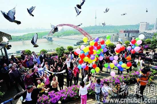 圖為:武漢市江漢區(qū)滿春街選出的12個幸福家庭,放飛希望之鴿 記者蕭顥攝