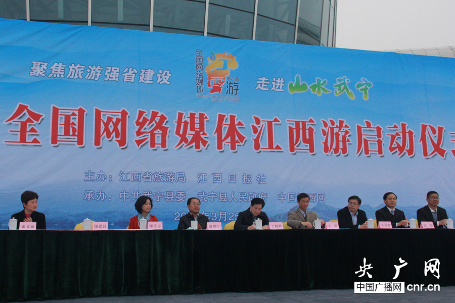 央廣網(wǎng)3月25日消息(記者劉千里)3月25日上午,“聚焦旅游強(qiáng)省建設(shè)——山水武寧·第六屆全國網(wǎng)絡(luò)媒體江西游”大型采風(fēng)活動(dòng)在江西九江武寧縣啟動(dòng)。江西省旅游局局長王曉峰,江西日報(bào)社社長王暉出席啟動(dòng)儀式并講話。九江市委常委、市委宣傳部部長潘熙寧宣布第六屆全國網(wǎng)絡(luò)媒體江西游正式啟動(dòng),并向媒體代表授旗。九江市副市長廖奇志在啟動(dòng)儀式上講話。武寧縣委書記沈陽致歡迎辭。
