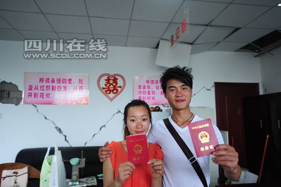 4月26日上午,小倆口跑到雅安市區(qū)照了相回來(lái),當(dāng)天下午就鉆進(jìn)了蘆山縣民政局所在的帳篷。下午下班之前,兩人終于取到了結(jié)婚證,笑得合不攏嘴。在蘆山縣民政局供新人合照的紀(jì)念墻前,一條V字形的裂紋刻進(jìn)了兩人的相片。