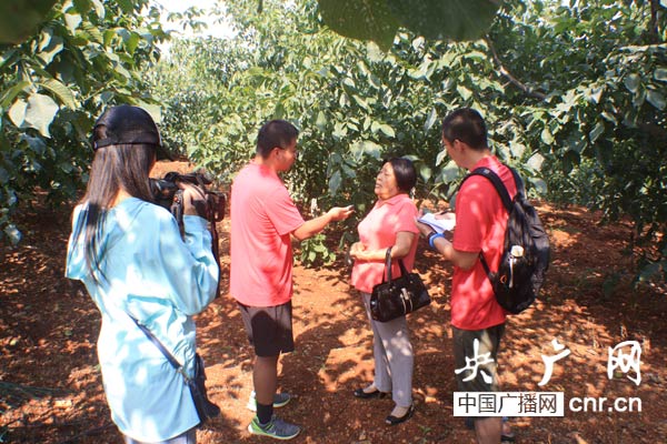 全國人大代表、湖北省丹江口市丹趙路辦事處茅臘坪村三組農(nóng)民辛喜玉(右二)在自家核桃園接受采訪
