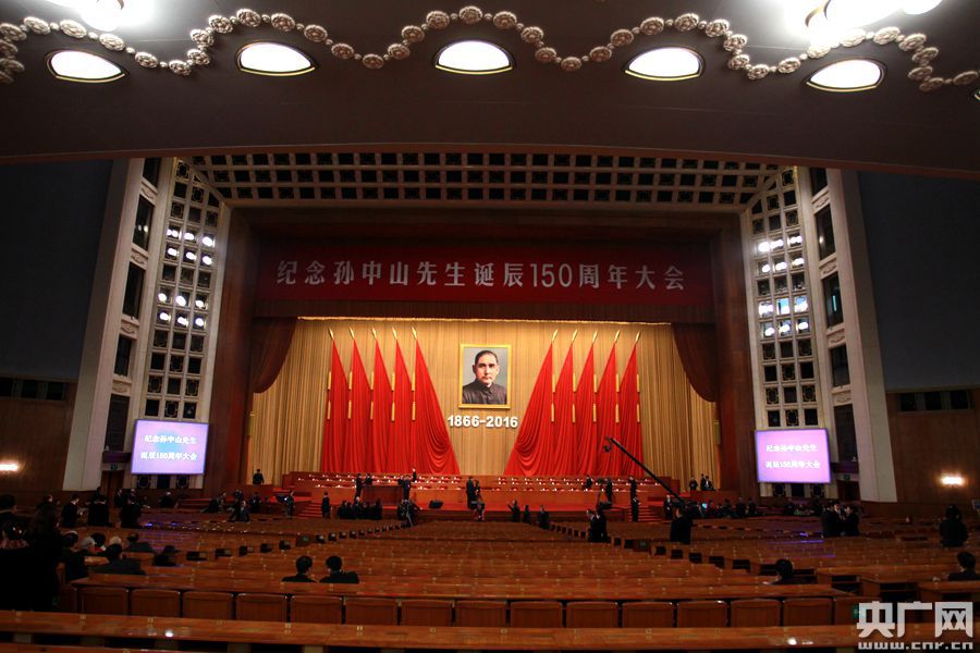 央廣網(wǎng)北京11月11日消息(記者 韓靖) 紀(jì)念孫中山先生誕辰150周年大會將于今日上午10點(diǎn)在人民大會堂舉行。圖為孫中山先生誕辰150周年大會現(xiàn)場。