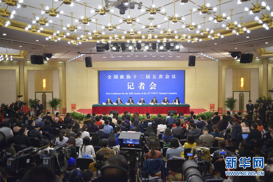 3月9日,全國(guó)政協(xié)十二屆五次會(huì)議舉行記者會(huì),邀請(qǐng)5位全國(guó)政協(xié)委員圍繞保障和改善民生的重點(diǎn)任務(wù),就精準(zhǔn)扶貧精準(zhǔn)脫貧、提高醫(yī)療公共服務(wù)水平、以創(chuàng)業(yè)帶動(dòng)就業(yè)、推進(jìn)養(yǎng)老服務(wù)、持續(xù)加強(qiáng)節(jié)能環(huán)保和生態(tài)建設(shè)等回答記者提問(wèn)。圖為記者會(huì)現(xiàn)場(chǎng)。新華網(wǎng)/中國(guó)政府網(wǎng) 傅義洲 攝