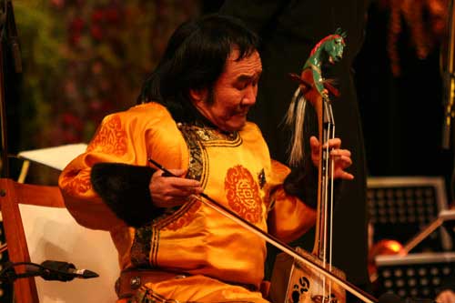 馬頭琴是中國蒙古民族樂器之一。馬頭琴的歷史可以追溯到成吉思汗時代,時稱潮爾。最初的馬頭琴琴箱是用一塊整木刳制而成。后經(jīng)過加工發(fā)展,始將其音箱以四塊木板拼成梯形,面蒙馬皮、羊皮(現(xiàn)改為蟒皮、桐木板等),用白馬尾或尼龍絲作琴弦和弓毛。琴頭、音箱鑲有骨雕裝飾品,并將琴頭雕刻成馬頭狀。馬頭琴適用于獨(dú)奏、合奏,現(xiàn)在已進(jìn)入交響樂。在第十一屆北京亞運(yùn)會上馬頭琴大師齊·寶力高曾率他的樂團(tuán)演奏了《萬馬奔騰》曲獲得成功。