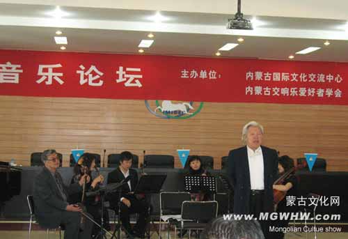 中廣網(wǎng)呼和浩特4月28日消息 內(nèi)蒙古國際文化交流中心和內(nèi)蒙古交響樂愛好者學(xué)會(huì)4月25日下午在國際文化交流會(huì)所舉辦了音樂論壇。該論壇由內(nèi)蒙古著名音樂藝術(shù)家、指揮家、文化中心理事永儒布倡議,旨在迎接奧運(yùn)會(huì),營造歡樂祥和的氛圍,凝聚自治區(qū)音樂創(chuàng)作人才,推動(dòng)民族音樂藝術(shù)事業(yè)大發(fā)展,促進(jìn)內(nèi)蒙古自治區(qū)民族文化大區(qū)建設(shè)。
