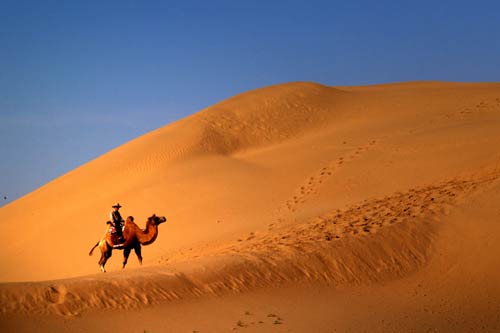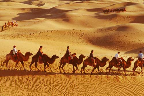 在這里滑沙,真是件最愜意不過的事了,坐在沙丘上,雙腿前伸,用力下滑時,耳畔會響起“嗡嗡”的轟鳴聲,隨著下滑速度的加快,聲音也越來越響,令人驚異不已。騎駱駝沙海探奇則是另一種體驗,在搖曳不定的駝背上,明麗的藍(lán)天、白云、黃沙都悠遠(yuǎn)無邊,讓人有一種神游物外的不真實感。 |