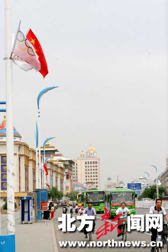 中廣網(wǎng)呼和浩特6月19日消息 記者近日在呼和浩特市的一些街道上看到,道路兩旁掛起了五星紅旗和奧運會會徽、會旗,為即將在內(nèi)蒙古進行的奧運圣火傳遞活動營造出莊嚴喜慶的氛圍。(孫慧)
