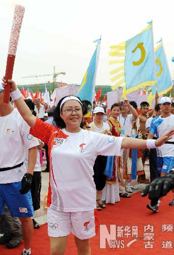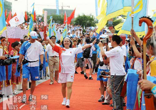 7月10日,最后一棒火炬手斯琴高娃高舉火炬。當日,北京奧運圣火在內(nèi)蒙古自治區(qū)赤峰市傳遞。 新華社記者張領攝