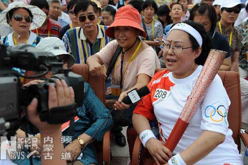7月10日,最后一棒火炬手斯琴高娃(右)接受記者采訪。當日,北京奧運圣火在內(nèi)蒙古自治區(qū)赤峰市傳遞。 新華社記者張領攝