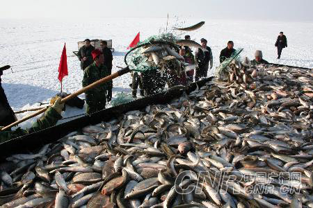 24日,是冬捕出魚的第一天,打眼、走桿、穿繩、下網(wǎng),在經(jīng)過捕魚工人一上午的忙碌后,下午一點多鐘,分布在湖區(qū)不同區(qū)位的三張400多米的沉重大網(wǎng)在拉網(wǎng)機的牽引下相繼被緩慢的拖上冰面。在一隊出網(wǎng)口,筆者有幸觀看了出魚的全過程:網(wǎng)內(nèi)的魚兒噼啪亂撞,隨著網(wǎng)口的拉開,一條條銀白色的華子魚和黑灰色的鯽魚不時躍出,或是翻回到網(wǎng)內(nèi),或是摔在冰面上......該隊蒙隊長拿一根長長的桿子往網(wǎng)中一探,高興得對大家說:“紅網(wǎng),這一定是紅網(wǎng)!睋(jù)捕魚工人講,一般夠上2萬斤的就稱為紅網(wǎng),像這樣的情況在前幾年并不多見,要是頭一天打魚就遇上紅網(wǎng)就更難得了。一位捕魚工人一邊往車上裝魚,一邊興奮地說:“今天太高興了,頭一天就打個紅網(wǎng),這預(yù)示著我們今年又是一個豐收年。”他順手抓起一條華子魚說:“你看,今年的魚個又大又勻稱,看來還是環(huán)境保護、養(yǎng)殖增值效益高!”下午4點多鐘,捕魚工人們迎著凜冽的寒風(fēng),隨著拉魚的拖車,一路歡笑,滿載而歸。