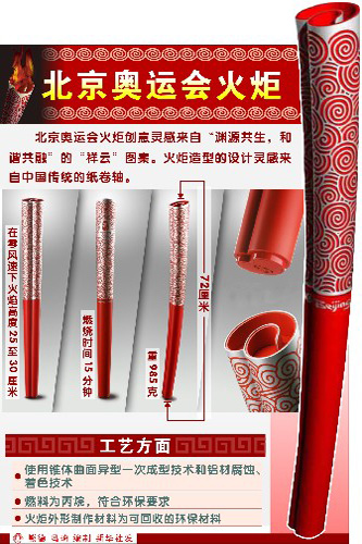 北京奧運(yùn)會(huì)火炬長(zhǎng)72厘米,重985克,燃燒時(shí)間超過15分鐘,能在每小時(shí)65公里的強(qiáng)風(fēng)和每小時(shí)50毫米雨量的情況下保持燃燒;鹧娓叨25至30厘米,在強(qiáng)光和日光情況下均可識(shí)別和拍攝。整個(gè)火炬高雅華麗,內(nèi)涵厚重,帶有濃郁的中國特色,和諧地將中國文化與奧林匹克精神結(jié)合在一起。其所蘊(yùn)含的“淵源共生,和諧共融”理念充分是對(duì)奧林匹克精神和奧林匹克圣火內(nèi)涵的一次獨(dú)特詮釋。祥云、漆紅、紙卷軸等中國元素的融入,使得古老的東方文明和現(xiàn)代的奧林匹克精神再一次完美結(jié)合,迸發(fā)出耀眼的火花。