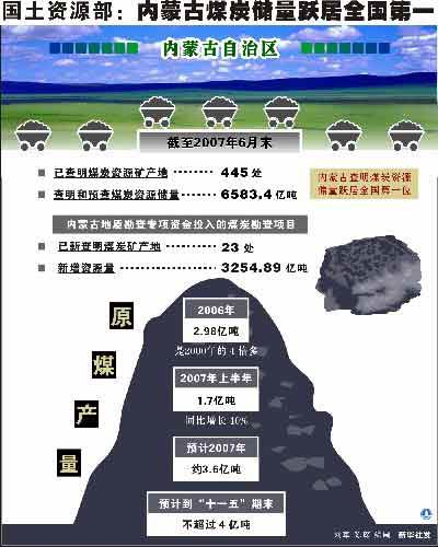 內(nèi)蒙古自治區(qū)是中國煤炭資源儲量最大的省區(qū),據(jù)國土資源部剛剛公布的消息說,內(nèi)蒙古自治區(qū)已經(jīng)查明和預(yù)查煤炭資源儲量達到6583.4億噸,超過山西省,居全國第一位。