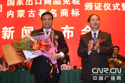 內(nèi)蒙古自治區(qū)副主席余德輝向眾環(huán)集團(tuán)頒發(fā)“內(nèi)蒙古著名商標(biāo)”牌匾
