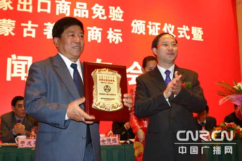 內(nèi)蒙古自治區(qū)副主席余德輝向眾環(huán)集團(tuán)頒發(fā)“出口商品免驗(yàn)證書”