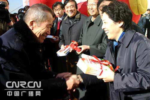 內(nèi)蒙古黨委宣傳部部長烏蘭向群眾贈送十七大圖書(馬立峰 攝)
