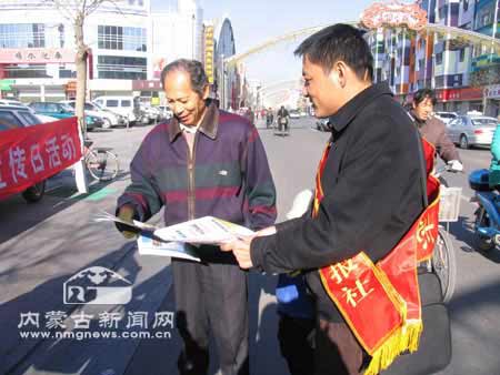 “12·4”是全國法制宣傳日,今年法制宣傳日的主題是“弘揚法治精神,推進依法治國”。當(dāng)日,內(nèi)蒙古法制報社的職工走上街頭發(fā)放普法材料,宣傳法律知識和法治精神,提高廣大市民的法律意識。