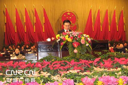 新當(dāng)選的內(nèi)蒙古自治區(qū)主席楊晶在會(huì)上講話