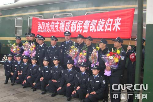 中廣網(wǎng)呼和浩特3月10日消息(記者鄭穎 通訊員張強、崔玉平)2008年3月9日11時30分,隨著載著呼鐵公安局包頭公安處支援成都春運工作民警的1718次列車?吭诎^東站,一剎那,鮮花和榮譽屬于這些凱旋歸來的鐵警英雄們,包頭鐵路公安處領(lǐng)導帶隊來車站迎接他們的歸來,標志著支援成都春運工作一個多月的包頭鐵路公安處20名民警圓滿完成工作任務(wù),凱旋歸來。