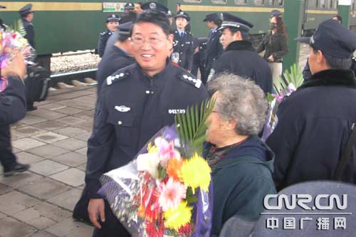 一位民警的母親來車站迎接兒子