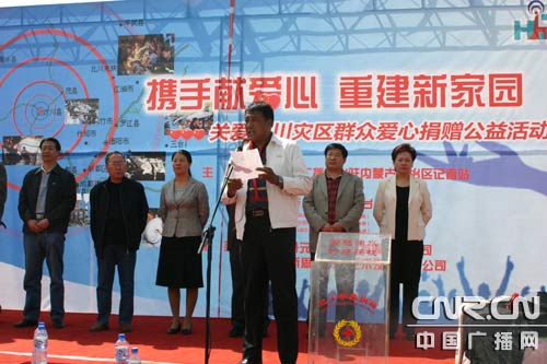 中廣網(wǎng)呼和浩特5月16日消息(記者陳青平、文偉)5月16日上午10:00,由中央人民廣播電臺內蒙古記者站、呼和浩特市紅十字會、呼和浩特人民廣播電臺共同發(fā)起的“攜手獻愛心 重建新家園”——關愛四川災區(qū)群眾愛心捐贈公益活動在呼和浩特市新華廣場舉行。截至記者發(fā)稿,共籌得善款432920.9元。其中中國移動呼和浩特分公司捐款10萬元。