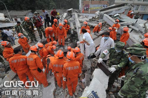 5月16日中午,內(nèi)蒙古消防赴川抗震搶險救援隊(duì)救援工作調(diào)整到鎮(zhèn)內(nèi)兩條街道上的居民區(qū),救援隊(duì)分成35個小組,重點(diǎn)對居民住宅和確認(rèn)有人埋壓的區(qū)域進(jìn)行搜救。