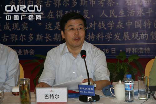 巴特爾代表黨委、政府在會上講話,強調(diào)胡總書記的談話意義重大,他說,“這既是對錢老沙產(chǎn)業(yè)創(chuàng)新理論的贊揚,也是對內(nèi)蒙古堅持科學(xué)發(fā)展觀的肯定”;“沙產(chǎn)業(yè)在內(nèi)蒙古是一項具有戰(zhàn)略意義的產(chǎn)業(yè),是造福人民、促進可持續(xù)發(fā)展的大事”。請專家們?yōu)閮?nèi)蒙古沙產(chǎn)業(yè)的科學(xué)發(fā)展獻計獻策。