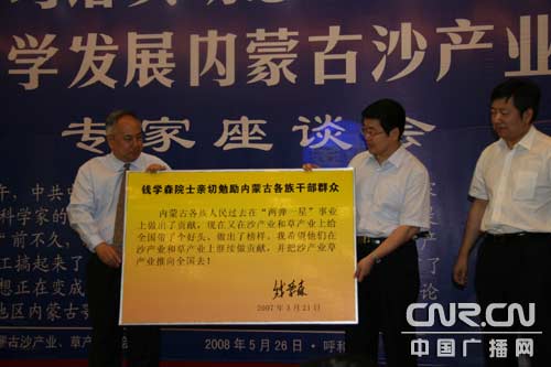 座談會上,國際知名度的沙產(chǎn)業(yè)資深專家劉恕談了錢老沙產(chǎn)業(yè)理論的形成和發(fā)展;《錢學(xué)森書信》十卷本主編、錢學(xué)森學(xué)術(shù)秘書涂元季教授講了對沙、草產(chǎn)業(yè)體現(xiàn)科學(xué)發(fā)展觀的認(rèn)識;錢永剛教授代表其父錢學(xué)森發(fā)言,回顧了胡總書記的看望情況,感謝黨中央的關(guān)懷;祝賀座談會成功,希望內(nèi)蒙古再接再厲。他和錢學(xué)森辦公室同志向自治區(qū)政府贈送了錢老簽名的一段話:“內(nèi)蒙古各民族人民過去在‘兩彈一星’事業(yè)上做出了貢獻,現(xiàn)在又在沙產(chǎn)業(yè)、草產(chǎn)業(yè)方面帶了個好頭,做出了榜樣,我希望他們把沙產(chǎn)業(yè)、草產(chǎn)業(yè)的經(jīng)驗推向全國去!”中國工程院院士任繼周先生、中國生態(tài)道德教育促進會會長陳壽朋教授等發(fā)來了賀信。中國科學(xué)院陳佐忠研究員、中國荒漠化防治基金會理事長安成信、國家交通運輸部楊利民同志、上海交大教授史貴全博士、中華原生態(tài)治沙工程聯(lián)合會首席顧問楊超教授、甘肅省沙、草產(chǎn)業(yè)協(xié)會副會長魏萬進教授及區(qū)內(nèi)專家、企業(yè)家代表作了精彩發(fā)言。