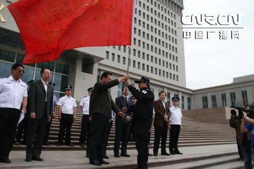自治區(qū)副主席連輯為救援隊授旗 內(nèi)蒙古自治區(qū)副主席任亞平:“同志們,內(nèi)蒙古自治區(qū)呼市公安局第二批赴四川災區(qū)抗震救災突擊隊現(xiàn)在出發(fā)!
