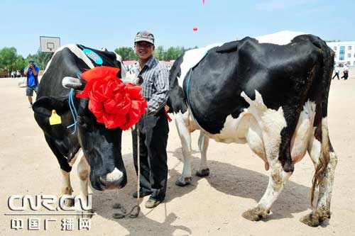 是誰(shuí)把這么多的奶牛牽到運(yùn)動(dòng)場(chǎng)上來(lái)了,怎么奶牛也都掛上了號(hào)牌子,它們也要參加比賽嗎?噢,不是!這些奶牛是參加選美來(lái)了,你看那些評(píng)委可都是扎蘭屯農(nóng)牧局、內(nèi)蒙古農(nóng)牧學(xué)校的專家啊,別小瞧這些黑白花大奶牛,這可是咱們農(nóng)民兄弟的小銀行啊!看,那獲得冠軍的大奶牛嘴里美滋滋地嚼什么呢,那高興壞了的主人手里拿的可是他心愛(ài)的奶牛剛剛得到的三千元獎(jiǎng)金?嘴都合不上了,回家可要好好犒賞犒賞有功之牛喲……