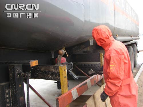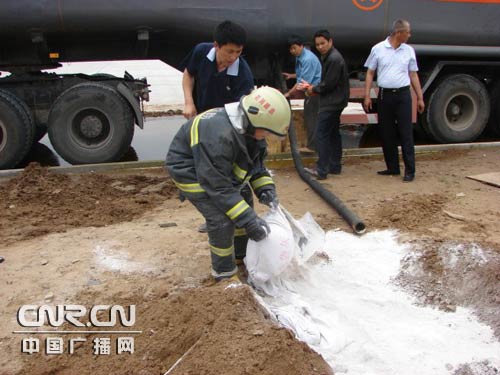翁旗消防中隊接到報警后,迅速出動2輛消防車11名消防官兵到場實(shí)施救援。到達(dá)現(xiàn)場后,官兵發(fā)現(xiàn),泄漏區(qū)緊靠服務(wù)區(qū)的超市和加油站,為防止鹽酸揮發(fā)殃及附近工作和其他生產(chǎn)設(shè)施,引發(fā)更大范圍的災(zāi)害,到場力量迅速與市環(huán)保局的工作人員研究處置措施,并及時向公安、醫(yī)療、路征、安監(jiān)等部門到場協(xié)助處置。