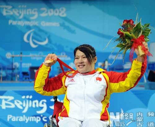9月13日,中國選手邊建欣在頒獎儀式上。 當(dāng)日,在北京2008年殘奧會女子60公斤級舉重比賽中,邊建欣兩次打破世界紀(jì)錄,最終以135公斤的成績奪得冠軍。 新華社記者楊磊攝