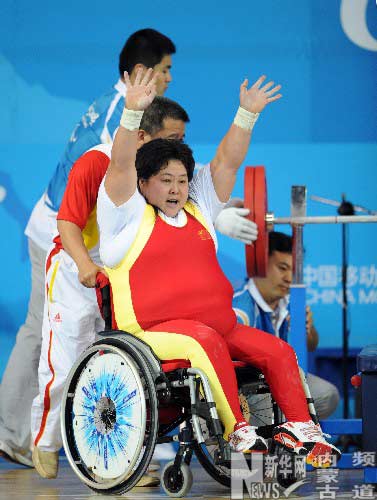 9月14日,中國選手李瑞芳試舉成功后向觀眾揮手致意。當(dāng)日,在北京2008年殘奧會女子82.5公斤以上級舉重比賽中,中國選手李瑞芳以165.0公斤的成績奪得冠軍。 新華社記者楊磊攝