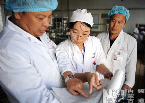 9月19日,呼和浩特市質(zhì)量技術(shù)監(jiān)督局經(jīng)濟(jì)技術(shù)開發(fā)區(qū)分局的兩名工作人員(左、右)在伊利金川奶粉生產(chǎn)廠查看半成品檢驗(yàn)報(bào)告單。 從9月17日開始,內(nèi)蒙古自治區(qū)派出質(zhì)檢部門工作人員,進(jìn)駐乳制品生產(chǎn)企業(yè)伊利、蒙牛,對企業(yè)每一批次的原奶和產(chǎn)品進(jìn)行嚴(yán)格監(jiān)控,確保產(chǎn)品質(zhì)量。 新華社記者 任軍川 攝