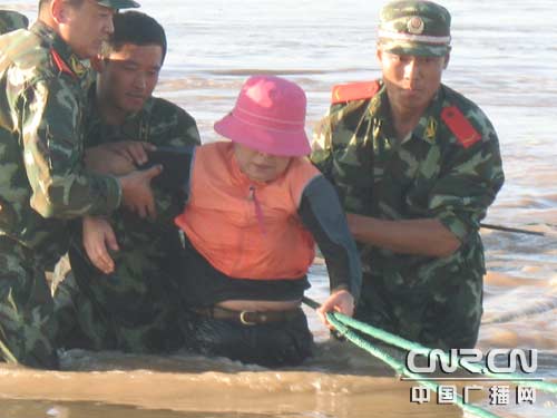 當(dāng)日16時36分,額濟(jì)納旗邊防大隊接到報警稱:一輛越野車在距達(dá)來庫布鎮(zhèn)西南方向20公里的漫水橋被河水沖下橋面,車內(nèi)5人被困,情況危急,請求救援。接警后,邊防大隊立即啟動處置突發(fā)事件預(yù)案,11名官兵攜帶繩索、鐵鍬等救援工具,兵分兩路火速趕赴漫水橋。事發(fā)現(xiàn)場,百余名游客及過往群眾站在河水兩岸焦急而又無奈地向河中心張望、呼喊。一輛越野車被湍急的河水沖下橋面,距河岸150多米遠(yuǎn),河水已漫至車窗上沿,5名乘客坐在越野車頂部瑟瑟發(fā)抖,等待救援。由于近日額濟(jì)納旗境內(nèi)降雨量增大,漫水橋河面水位暴漲,水流湍急,越野車隨著水浪左右搖擺,隨時有被掀翻的危險,5名游客的生命岌岌可危。救援人員兵分兩組,身材較為高大的一組將繩索系住腰部,手挽手下河救援;另一組緊緊拉住繩索,確保救援官兵和被救群眾的安全。由于驚嚇過度兩名女游客,蜷縮在越野車頂部,驚恐地看著河水,不肯配合救援。經(jīng)過救助官兵在冰冷的河水中耐心勸導(dǎo),兩名女游客最終才接受救助。經(jīng)過一個小時的緊急救援,5名被困人員在河水漫過車頂之前全部被安全救出。經(jīng)了解,5名受困人員中4名是來額濟(jì)納旗旅游的韓國人,駕駛員系呼和浩特市某旅游局職工。5人在怪樹林拍照返回途中,由于駕駛員對漫水橋面情況不熟悉、對水勢估計不足,導(dǎo)致車輛被河水沖下橋面,險些釀成車毀人亡的慘劇。