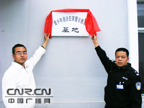 扎蘭屯市公安局監(jiān)管大隊(duì)與六中負(fù)責(zé)人為青少年違法犯罪警示教育基地揭匾