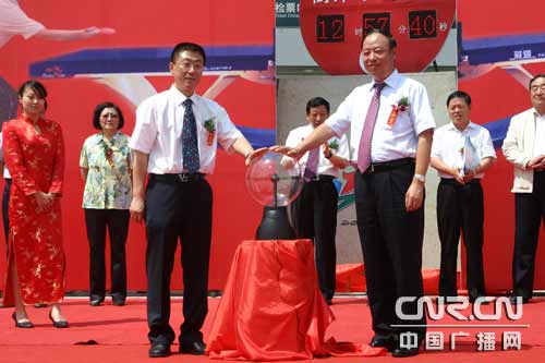 內蒙古自治區(qū)副主席劉新樂(前右)與國家體育總局乒羽中心副主任于斌啟動倒計時計時器。(攝影/馬立峰)
