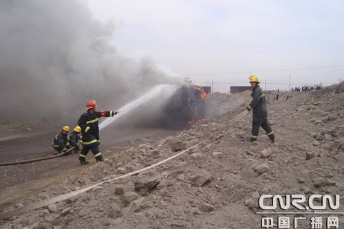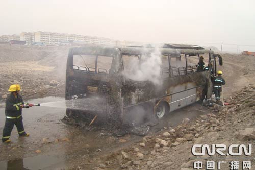 接到報(bào)警后,支隊(duì)當(dāng)日值班指揮長(zhǎng)迅速指派轄區(qū)消防一中隊(duì)出動(dòng)兩輛大噸位水罐車20名消防員前往火災(zāi)地點(diǎn)。消防官兵到達(dá)現(xiàn)場(chǎng)后,發(fā)現(xiàn)一輛車牌號(hào)為蒙M07468的大客車處于猛烈燃燒階段,在詢問(wèn)得知沒(méi)有人員被困后,消防中隊(duì)指揮員果斷下令,出2支水槍進(jìn)行滅火,一支水槍負(fù)責(zé)對(duì)準(zhǔn)該車起火部位右后側(cè)尾部出水,另一支水槍冷卻油箱,由于出動(dòng)及時(shí),戰(zhàn)術(shù)運(yùn)用恰當(dāng),整個(gè)滅火戰(zhàn)斗15分鐘結(jié)束,成功保護(hù)住了車輛前端部分,最大限度的挽救了財(cái)產(chǎn)。